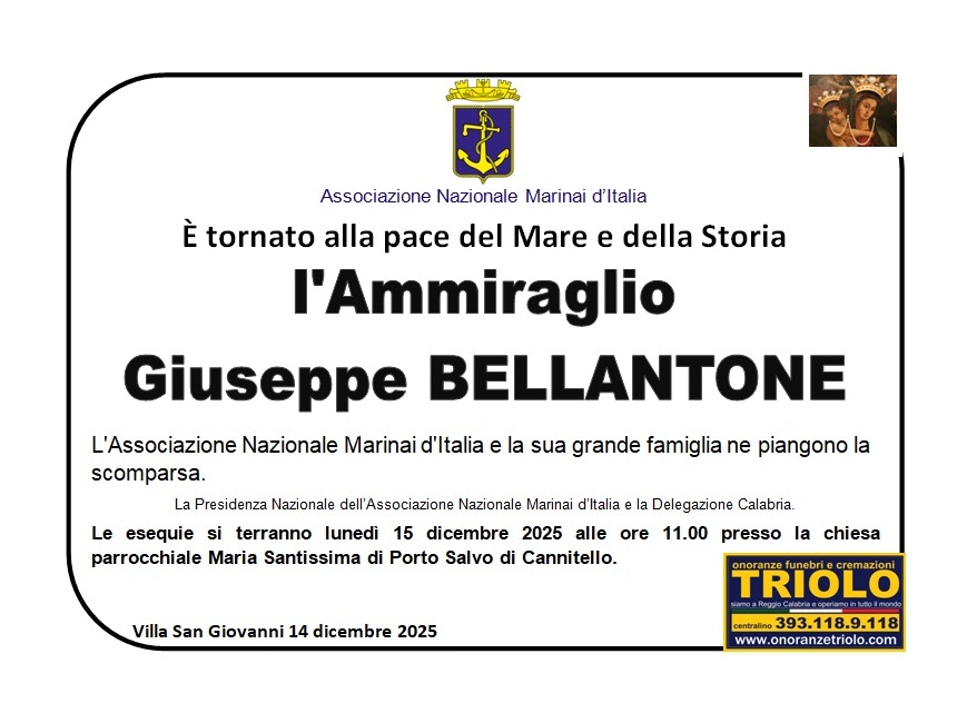 Le esequie si terranno lunedì 15 dicembre 2025 alle ore 11.00 presso la chiesa parrocchiale Maria Santissima di Porto Salvo di Cannitello in Villa San Giovanni RC.
