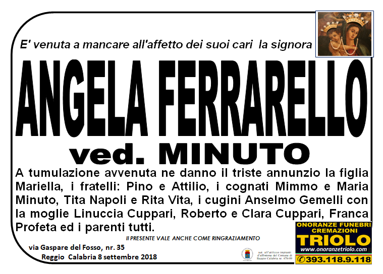 Set 6, 2018 #A tumulazione avvenuta ne danno il triste annunzio la figlia Mariella, #calabria, #è morta Angela Ferrarello Minuto, #è morta Angela Ferrarello Tortorella, #Franca Profeta ed i parenti tutti., #funerali, #i cognati Mimmo e Maria Minuto, #i cugini Anselmo Gemelli con la moglie Linuccia Cuppari, #i fratelli: Pino e Attilio, #reggio, #Roberto e Clara Cuppari, #Tita Napoli e Rita Vita