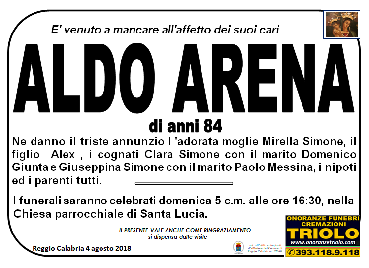Ago 5, 2018 #aldo arena, #i cognati Clara Simone con il marito Domenico Giunta e Giuseppina Simone con il marito Paolo Messina, #i nipoti ed i parenti tutti., #il figlio Alex, #Ne danno il triste annunzio l 'adorata moglie Mirella Simone