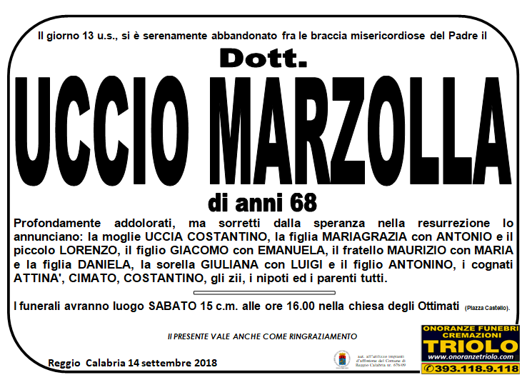 Set 14, 2018 #CIMATO, #costantino, #dottor, #gli zii, #i cognati ATTINA', #i nipoti ed i parenti tutti. I funerali avranno luogo SABATO 15 c.m. alle ore 16.00 nella chiesa degli Ottimati (Piazza Castello)., #il figlio GIACOMO con EMANUELA, #il fratello MAURIZIO con MARIA e la figlia DANIELA, #la figlia MARIAGRAZIA con ANTONIO e il piccolo LORENZO, #la sorella GIULIANA con LUIGI e il figlio ANTONINO, #ma sorretti dalla speranza nella resurrezione lo annunciano: la moglie UCCIA COSTANTINO, #Profondamente addolorati, #uccio marzolla